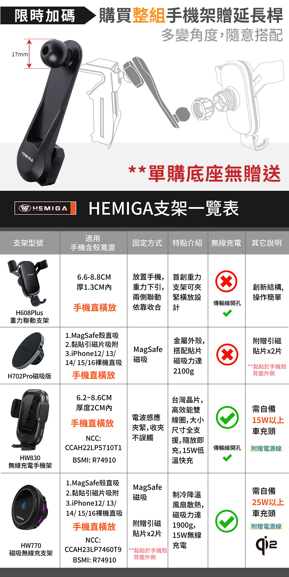 底座+H608Plus重力支架【T款】 底座+H702Pro磁吸版【T款】 底座+HW830無線充【T款】 底座+HW770磁吸無線充【T款】 單購底座含球頭【無手機架】【T款】